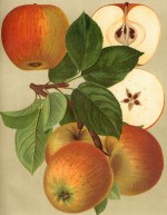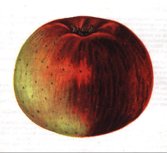 Frucht : großer, breiter, dunkelrot gestreifter, fein gewürzter Tafelapfel, Schale glatt und fettig, nicht windfest