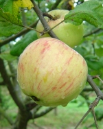 Frucht : runder, schön gefärbter, erfrischend feinsäuerlicher Frühapfel