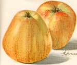 Frucht : mittelgroß, stumpfkegelige Form, duftende, glatte Schale; gelb-rötlich gefärbt, mit roten Streifen und Sprenkeln.