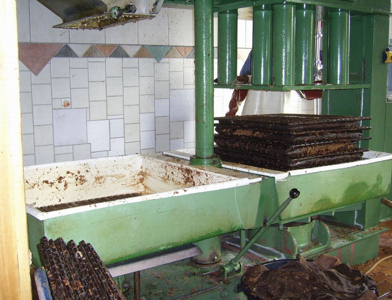 Wir bestimmen, welche Äpfel (handverlesen) in welchen Mengen, in die zu mostende Mischung kommen. Diese fahren wir selbst nach Karmitz (auch im Wendland, ca. 30 Km von uns) zu Clan e.V., einer kleinen Mosterei Kommune aus überwiegend jungen Leuten. Dort schütten wir die Äpfel selbst in den Wassergefüllten (Reinigung) Vorratsbehälter (Abb.1), von wo aus sie mittels einer sog. Schnecke in die Rätzmühle gelangen und von dort, nach Bedarf auf den Schwenktisch der Presse (Abb.2). Hier werden die Äpfel mit ca.150 bar / qcm gepresst. Der Saft wird dann in einen Vorratstank gepumpt und von dort über eine Gefälleleitung durch den Plattenerhitzer zu den Abfüllhähnen geleitet. Hierbei wird peinlichst genau darauf geachtet, dass die Temperatur von 70 Grad (68 ist das absolute Minimum, wg. der Haltbarkeit) nicht unter- und von 75 Grad (je heißer, je mehr leiden Vitamine, andere Inhaltsstoffe und Geschmack) nicht überschritten wird. An 2 Abfüllhähnen stehen 2 Mitarbeiter, befüllen die braunen (Lichtschutz) 1ltr.Flaschen bis zum Rand und drehen den praktischen Twist off Deckel drauf. Dabei stehen die Flaschen in den 6er Kisten. Diese werden anschließend in einen Behälter mit lauwarmem Wasser getaucht (wg. Abkühlung und Reinigung), herausgenommen, einlagig auf eine Palette gestellt und dort noch mal mit kühlem Wasser abgebraust. Ist die Palette voll, wird diese mit einem sog. "Hund" zum Auto gefahren und die Saftkisten in Auto und Anhänger gepackt. Zu Hause muss der Saft frostfrei aber möglichst trocken, kühl und dunkel gelagert werden. Vor dem ausliefern werden die Flaschen von Hand etikettiert.